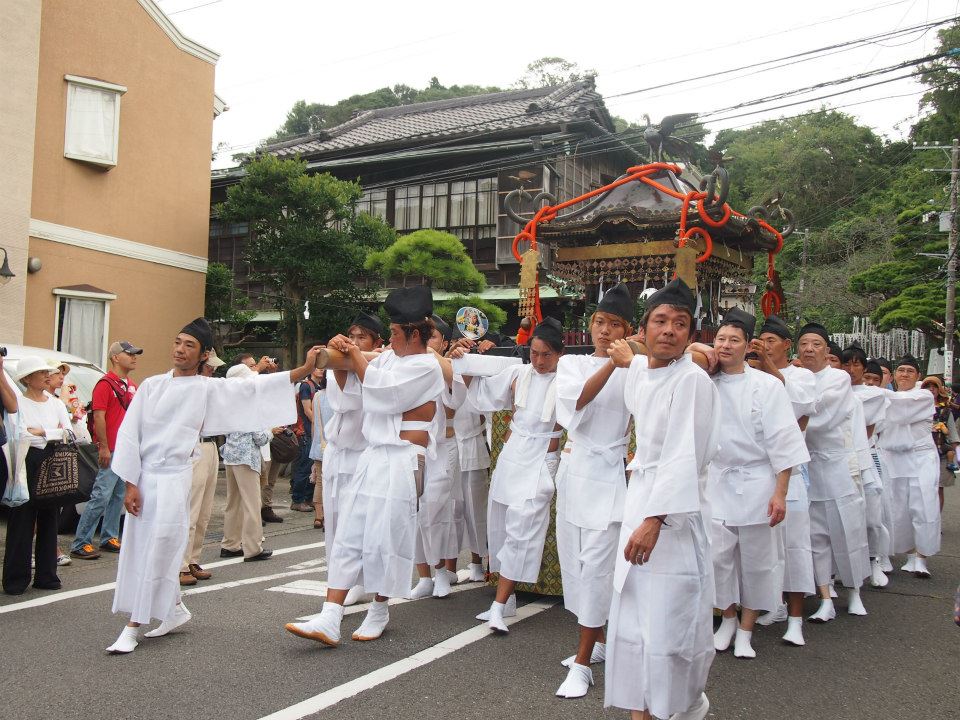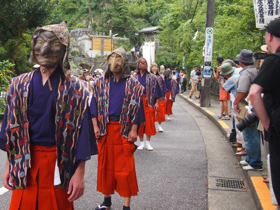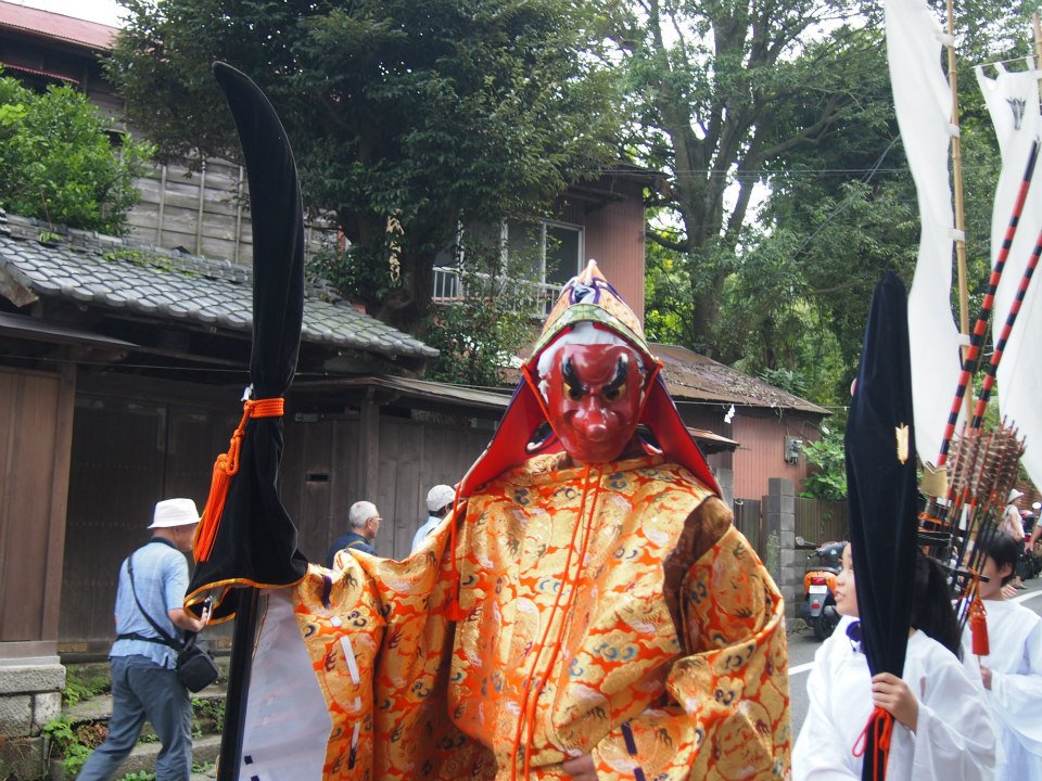 坂の下の御霊神社では、毎年9月18日に“面掛行列”というユーモラスな行列が行われます。爺・鬼・烏天狗・おかめ・ひょっとこ・・・などの面をつけた面掛十人衆が町内を練り歩き、豊作・豊漁を祈願する例祭です。