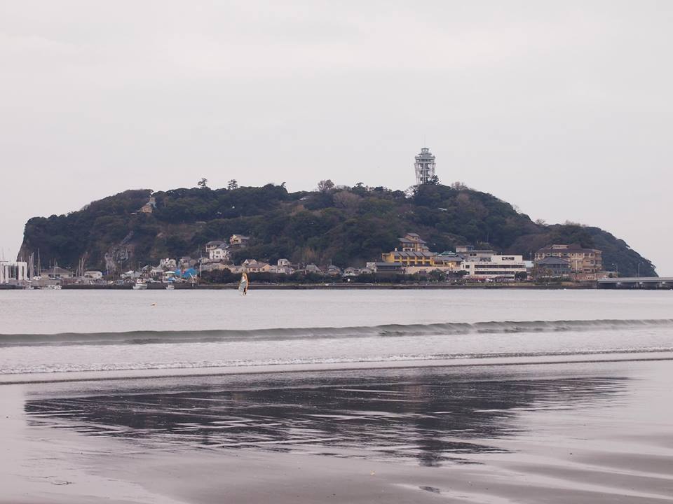 冬の寒さが戻ってきた湘南、腰越海岸から見る江の島はモノクロ写真のようです。