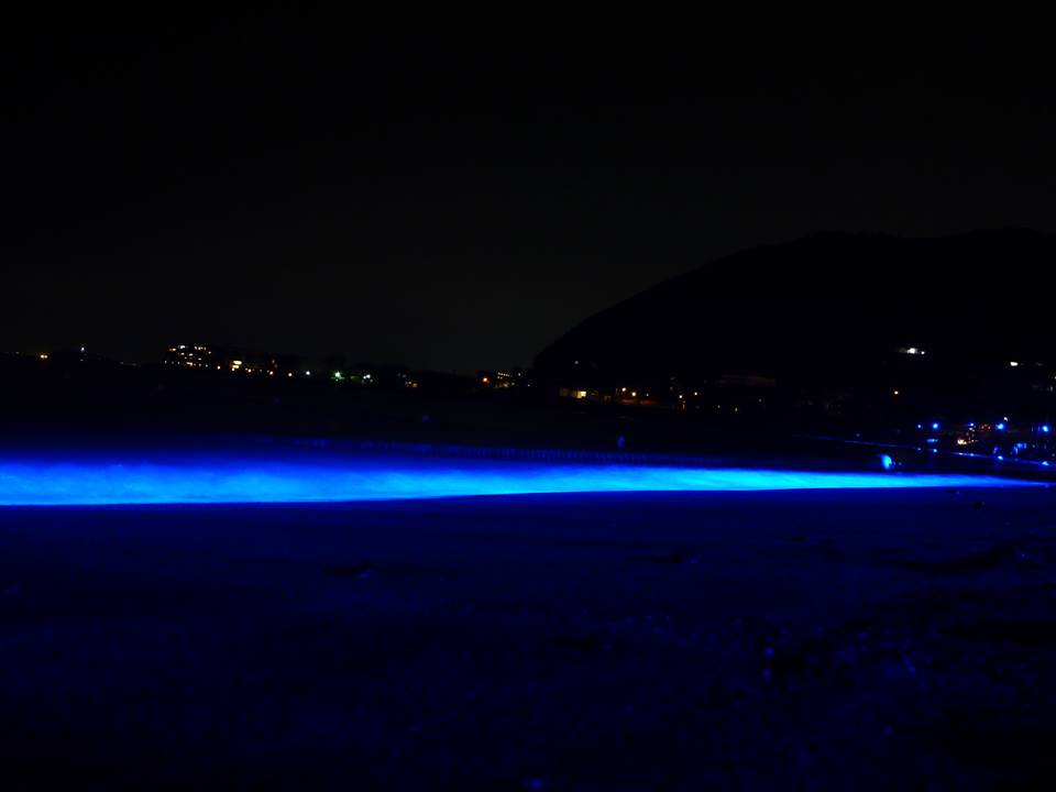 夜光虫のようにブルーの光が夜の波打ち際を照らします。