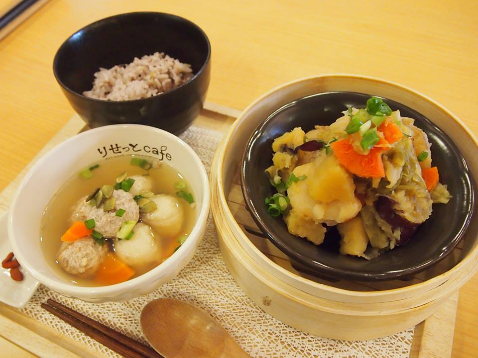 キャベツ、じゃがいも、さつま芋、にんじん・・代謝を高める食材の盛り合わせ。その名も‘お疲れさん「りせっとCafe」にて、パワーアップスープと五穀ごはんです。