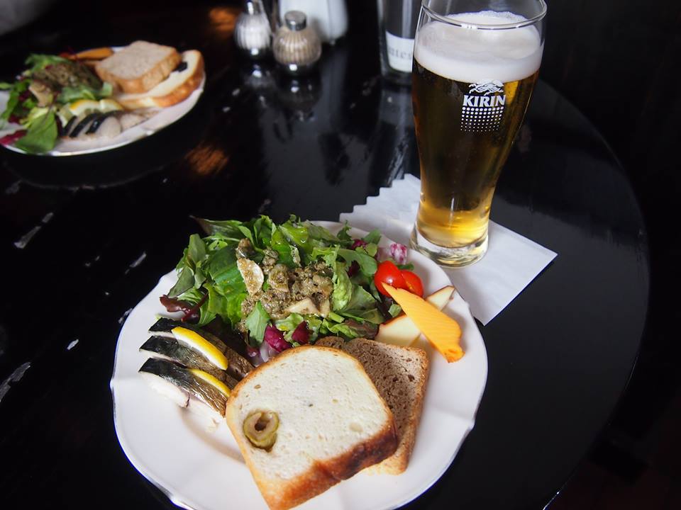 自家製のパン2種類にチーズと野菜サラダ、自家製季節の魚(サバ)の燻製。