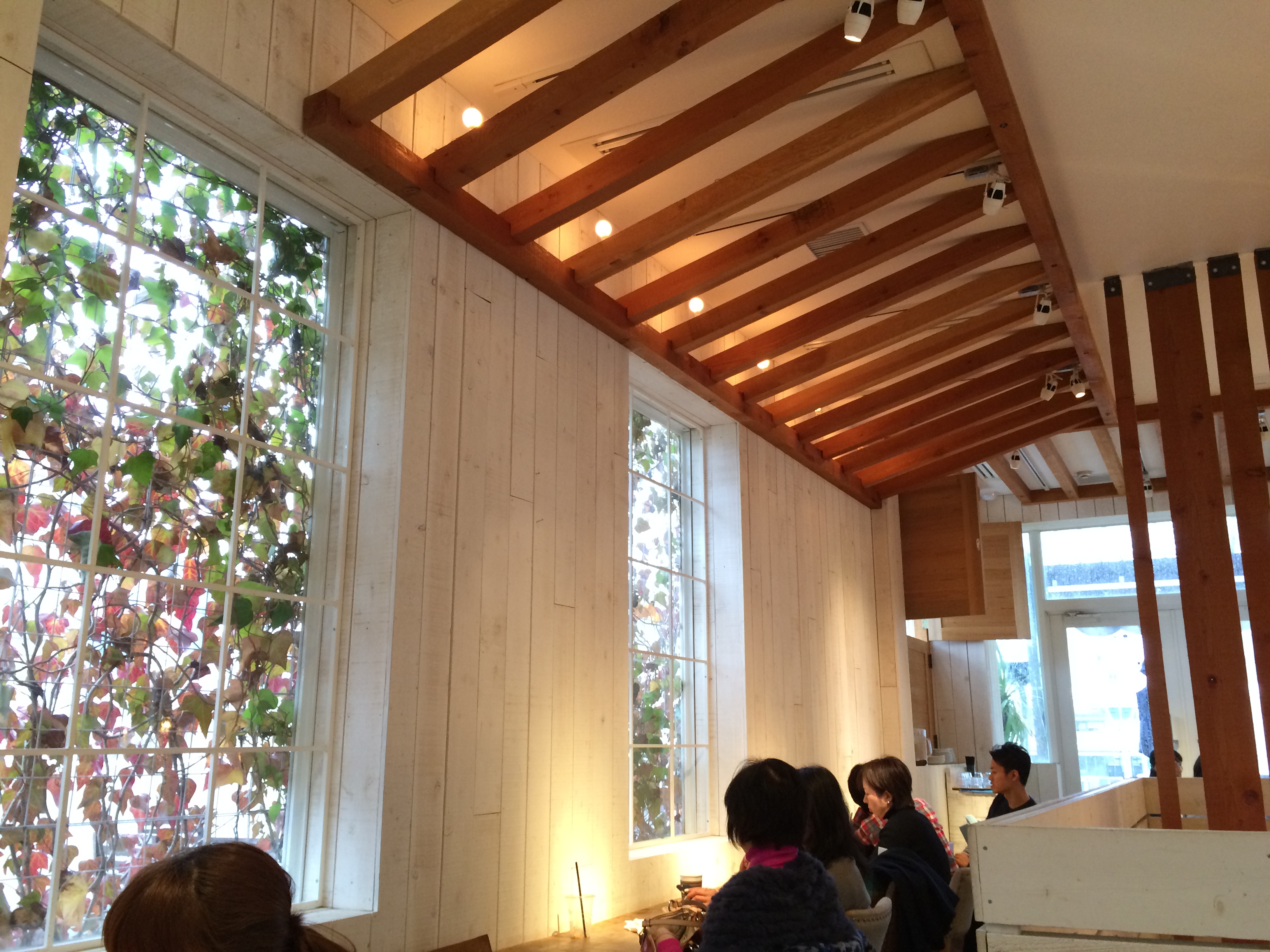 ツタの葉に覆われ、木のぬくもりを感じる落ち着いた空間は、外の雨音を聞きながらゆっくり読書にふける人、お友達とお茶する人、家のリビングにいるように過ごせます。