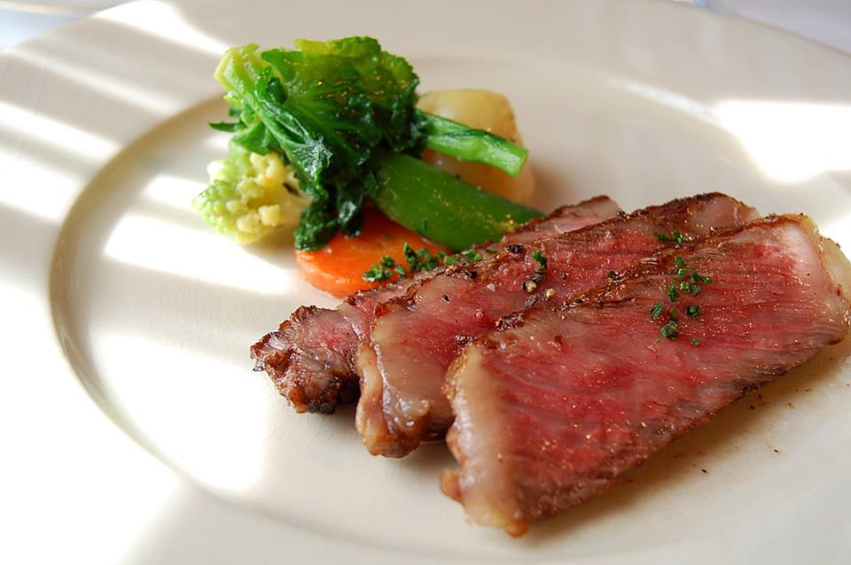 新鮮な有機野菜をふんだんに使った前菜に始まり、フォアグラと和牛のいただける5800円のコースの中、写真は黒毛和牛リブロースの備長炭焼きです。