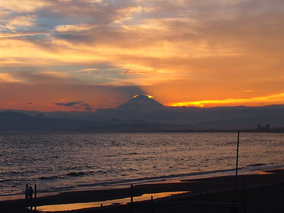 夕方片瀬海岸に着いた時は見えなかった富士山が、日が沈む時ははっきり見えてきました!