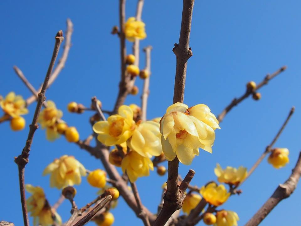 川沿いの陽だまりでは、まだ寒い1月~2月頃に花を咲かせる蝋梅(ロウバイ)が早くも咲き始めていました。