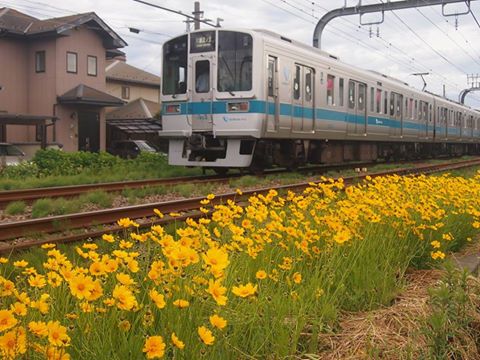 小田急江ノ島線や江ノ電の線路沿いに黄色いオオキンケイギクが咲いています。
