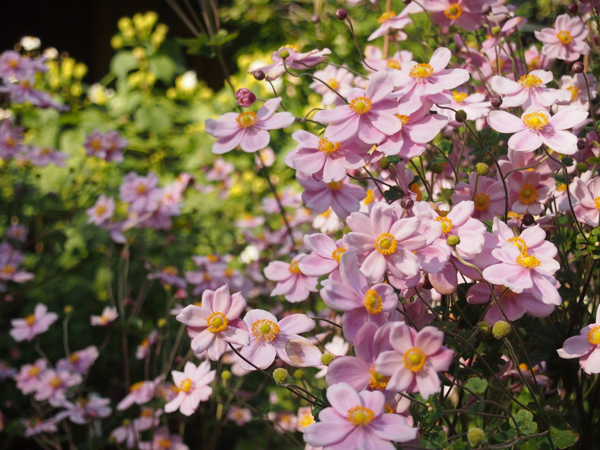 南国のような花を咲かせる花ジンジャー、別名ハナショウガにシュウメイギク、オミナエシ、ホトトギス、水引き等、控えめな秋の花が静かに咲いています。